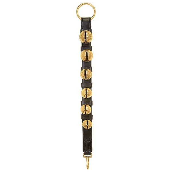 - Doubled leather straps with a solid brass 2-1/2″ ring, snap and bells