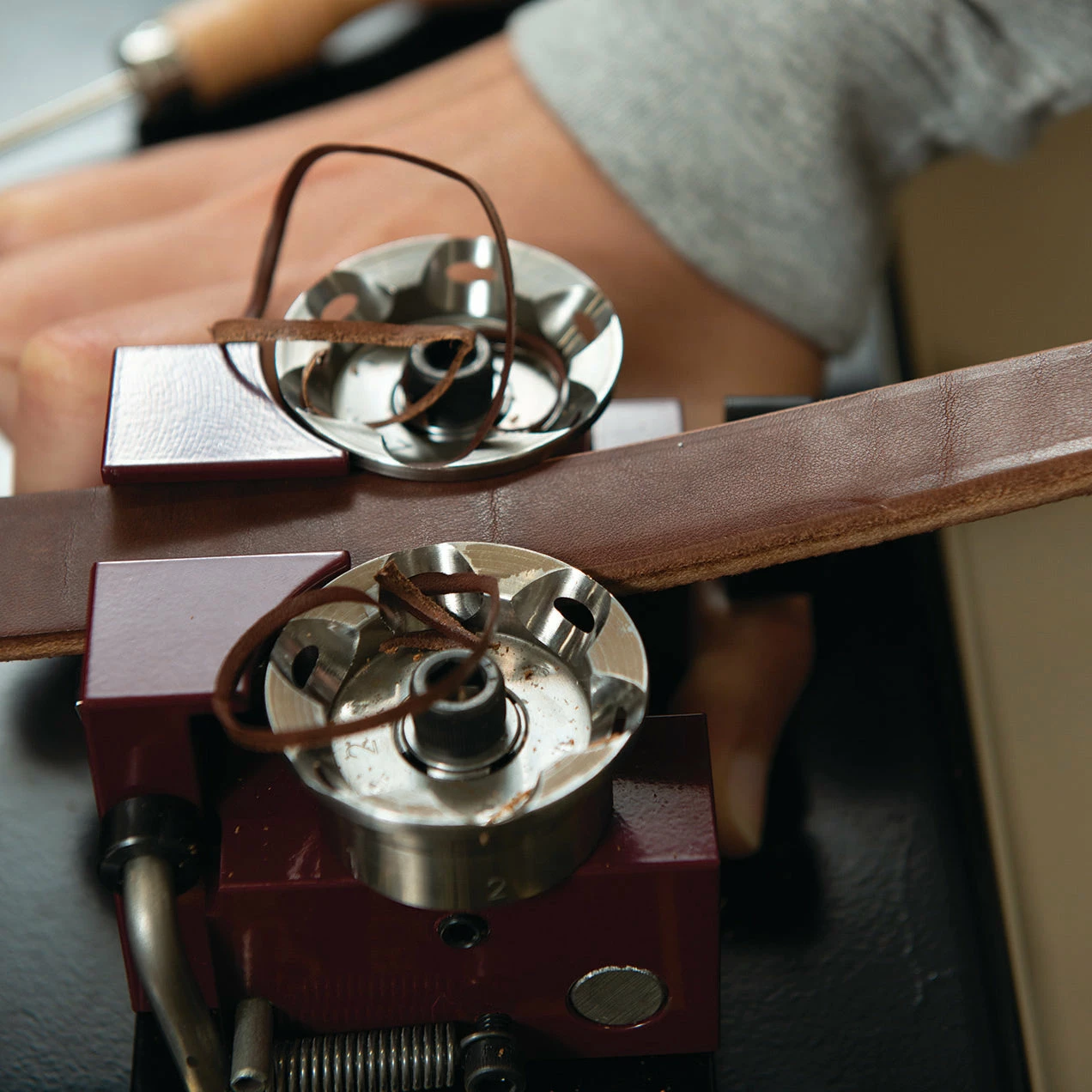 - Compact, hand-operated, leather beveler machine does not decrease strap width